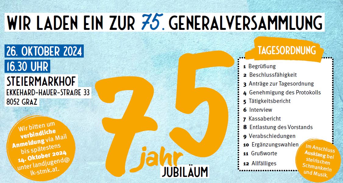 Höhepunkte sind die Präsentation der Tätigkeiten des abgelaufenen Landjugend Jahres sowie dieErgänzungswahlen, wo neue Funktionär:innen in das Landes-Führungsteam der Landjugend gewählt werden. Außerdemwird das 75 Jahr Jubiläum im Rahmen der Generalversammlung bzw. danach bei einem geselligen Ausklang mit Musik,Speis und Trank, gebührend gefeiert.