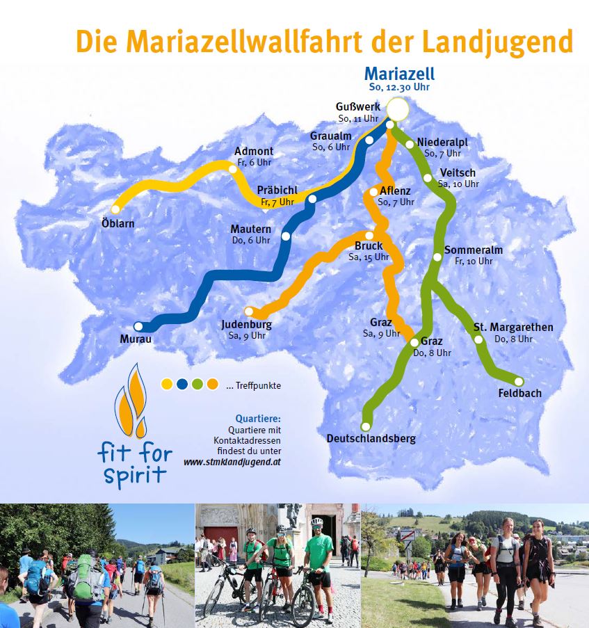 Am 8. September 2024 werden wir gemeinsam in der Basilika von Mariazell den Abschlussgottesdienst der Landjugend-Wallfahrt "Fit for Spirit" feiern. Für alle Teilnehmer:innen, die sich und ihre Wandergruppe bis 2. August 2024 anmelden, gibt es ein gratis Erinnerungs-T-Shirt vor Ort!