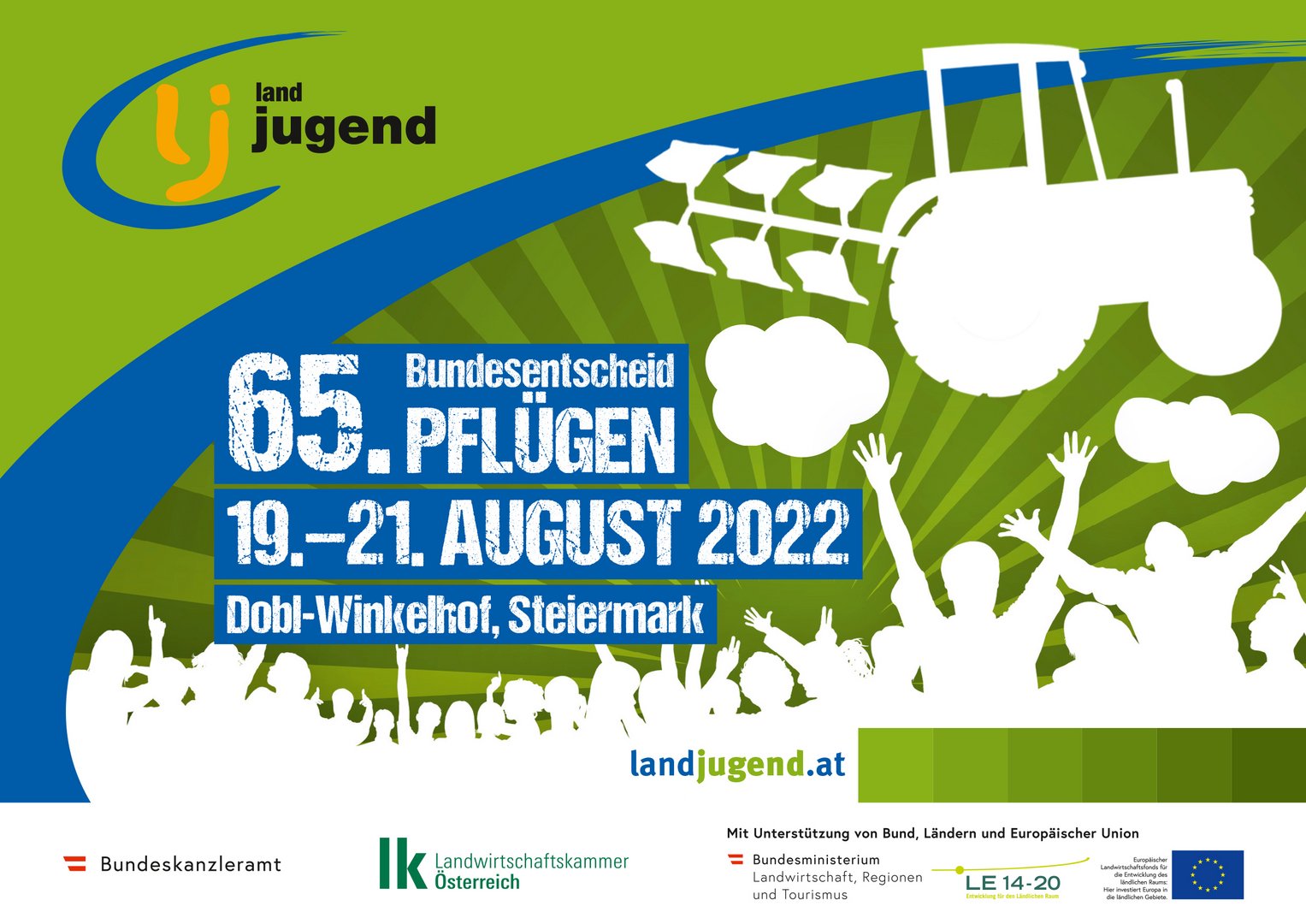 Die Arbeitsgemeinschaft für Landjugendfragen in der Landwirtschaftskammer Österreich veranstaltet mit Unterstützung des Pflügerkomitees der Landjugend Österreich, des Bundesministeriums für Land- und Forstwirtschaft, Regionen und Wasserwirtschaft und der Landjugend Steiermark geimeinsam mit der LJ Region SÜD-WEST von 18. – 20. August 2022 den 65. Bundesentscheid Pflügen in Dobl, Steiermark.