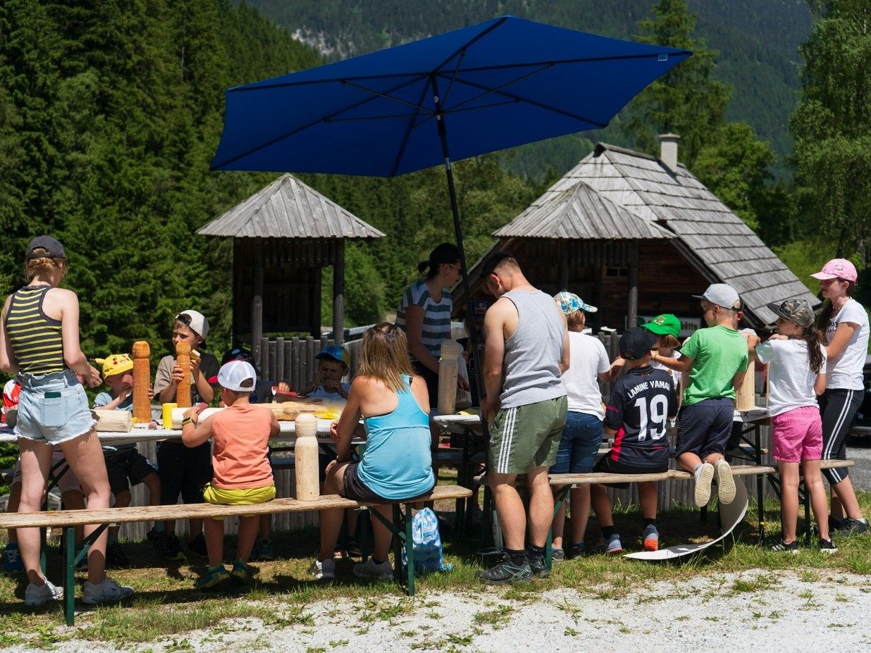 Dann folgte die Umsetzung – und damit die eigentliche Herausforderung. Die Gemeinde Pusterwald unterstützte uns von Anfang an. Kindergarten und Volksschule freuten sich auf die Zusammenarbeit, und zwei Tischler stellten ihr Wissen und ihre Fähigkeiten zur Verfügung. Nach der Materialbeschaffung ging es richtig los: Unsere Tischler und viele fleißige Hände der Landjugend fertigten Kegel und Spielfeld. Stunden an der Drechselbank, an Schleifmaschinen, unzählige Skizzen und Bemessungen später nahm unsere Idee langsam Gestalt an. Schließlich war alles bereit für den Aufbau und die Gestaltung bei der Goldwaschanlage.